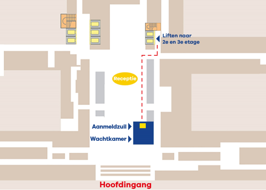 Op OLVG, locatie West werken we met een routesysteem. Elke afdeling of polikliniek heeft een eigen routenummer. Vanaf de hoofdingang kunt u de juiste looproute volgen. U neemt de lift naar de juiste etage.