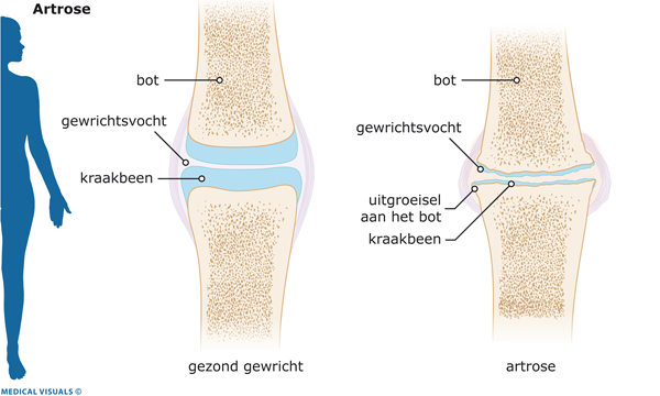 Bij artrose is het kraakbeen dun en niet glad. Daardoor beweegt het gewricht minder makkelijk. Ook is het laagje cellen (slijmvlies) aan de binnenkant van het gewricht steeds ontstoken.