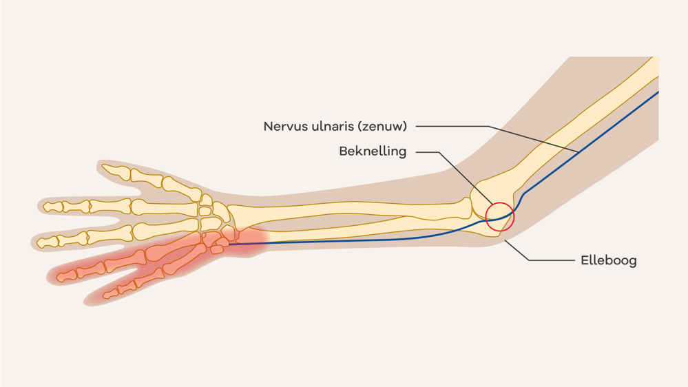Een van de grote zenuwen in uw arm heet nervus ulnaris. Deze zenuw loopt via de binnenkant van de elleboog naar uw hand. Deze zenuw kan beschadigen door een ontsteking of door uw arm of elleboog te veel te bewegen.