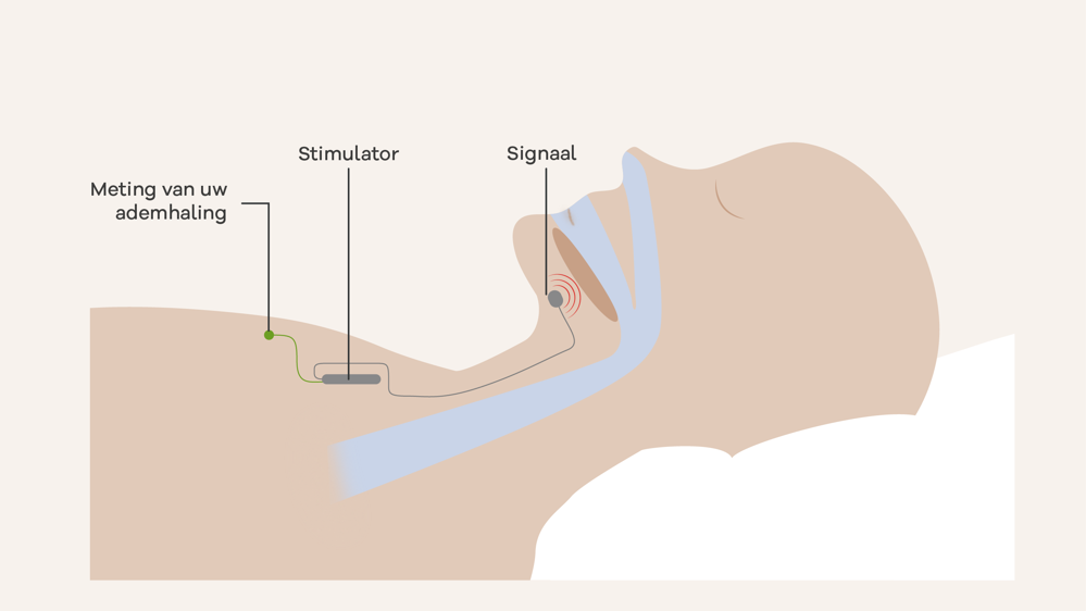 Bij het stimuleren van de tongzenuw krijgt uw tong een klein elektrisch signaal tijdens het inademen. Dit is in het begin even wennen. Door het elektrisch signaal gaat de tong iets naar voren en blijft de keel open. U heeft dan minder ademstops. Voordat u gaat slapen, zet u de stimulator aan. Als u weer wakker bent, zet u de stimulator weer uit.