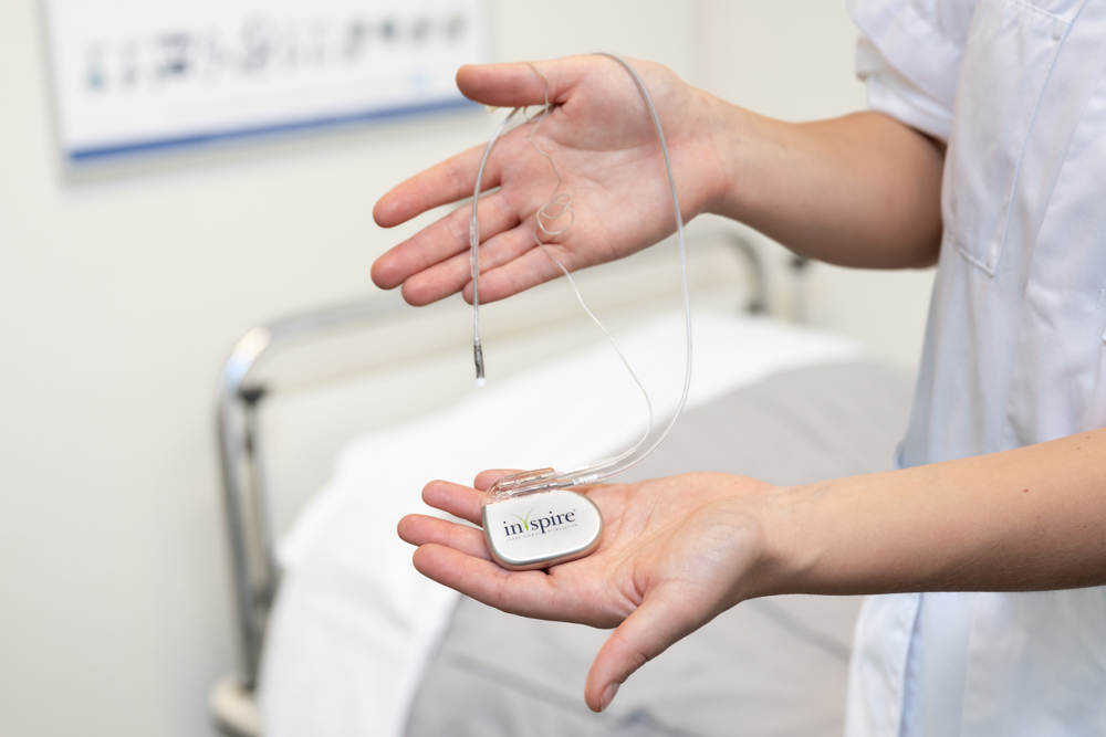 Bij een Inspire implantaat krijgt u een stimulator onder de huid van de borst. De stimulator werkt samen met een sensor die uw ademhaling meet.