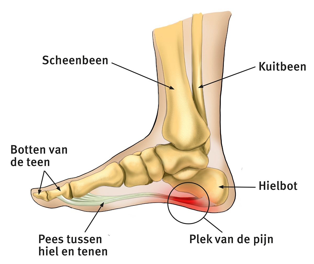 De pees trekt dan hard aan de plek waar deze vast zit aan de hiel. Dit zorgt voor pijn op deze plek.